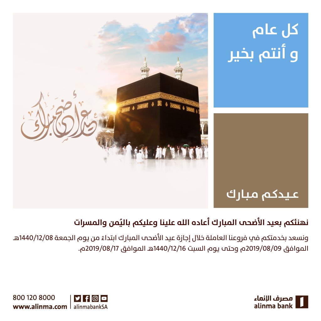 مصرف الإنماء On Twitter شريكنا العزيز بمناسبة عيد الأضحى المبارك يسر مصرف الإنماء بتقديم خالص التهاني والتبريكات سائلين الله عز وجل أن يتقبل صالح الأعمال ونسعد بخدمتك في فروعنا العاملة خلال العيد الرياض